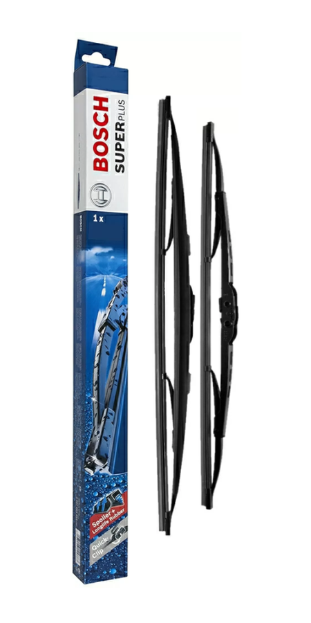 BOSCH's Super Plus range of wiper blades presents a traditional style wiper, designed for vehicles with a hook-type wiper arm. They feature a robust metal frame for optimum strength and durability and offer a universal fitting for both left and right-hand drive vehicles.